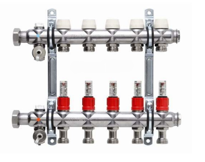 Подающие коллекторы системы теплого водяного пола Kermi оснащены регулируемыми расходомерами со шкалой от 0 до 5 л/мин для балансировки расхода в каждой петле, с возможностью полного закрытия петли, позволяющими точно и удобно отрегулировать расход воды не пользуясь инструментами.